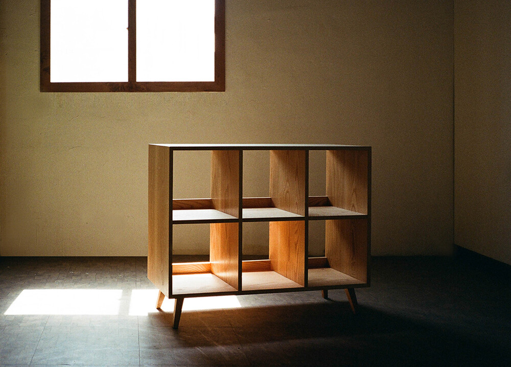 정사각형 비율로 칸을 맞춘 원목 책꽂이.